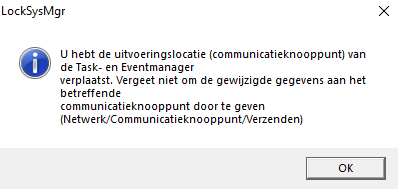 - Uw LSM wijst u erop dat u het communicatieknooppunt dat verantwoordelijk is voor de taak-/gebeurtenismanager hebt gewijzigd.