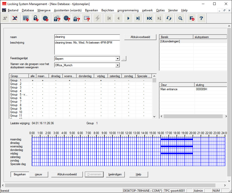 Maak altijd eerst een tijdzoneplan aan en wijs dit later toe aan een zone of een afzonderlijk sluitelement. Dit gebeurt bijv. met Bewerken/Zone.