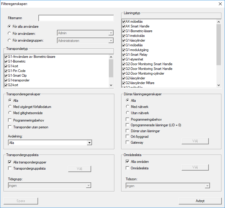 Låssystemet har blivit ännu lättare att hantera genom användning av filter. Du kan välja många olika filteralternativ och göra dessa filter tillgängliga för olika personer eller persongrupper. Genom att visa de valfria extraspalterna får du tillgång till ytterligare information och med filterfunktionen kan du dessutom ha en god översikt över dina vyer.