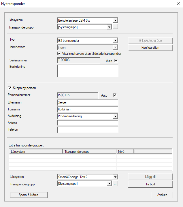 Om flera låssystem och transpondergrupper har skapats kan den nya transpondern tilldelas dessa direkt. Detta kan göras med hjälp av rullgardinsmenyerna.