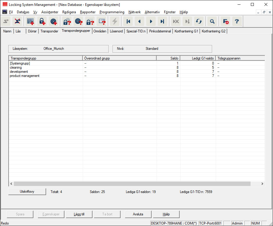 Denna registerflik ger en översikt över de transpondergrupper som används i låssystemet. De visas detaljerat i en tabell.