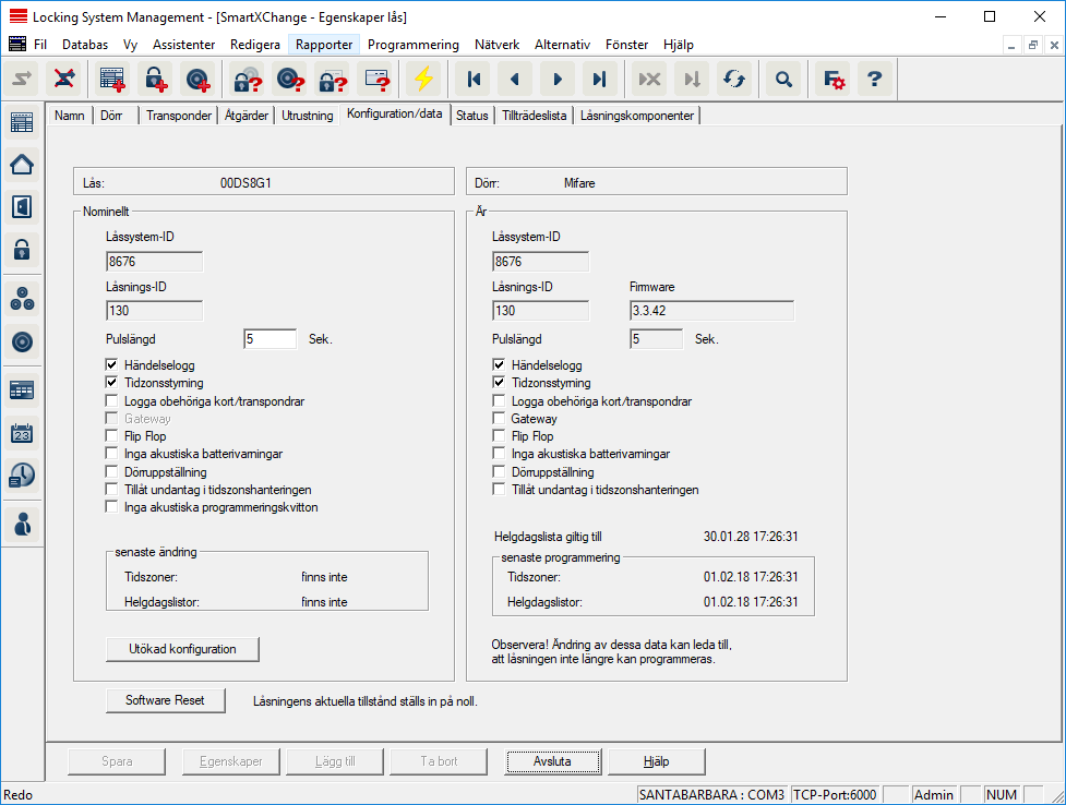 - På vänster sida visas låsets nominella status – alltså den status som konfigurerats i LSM Software och som man vill att låset ska ha.