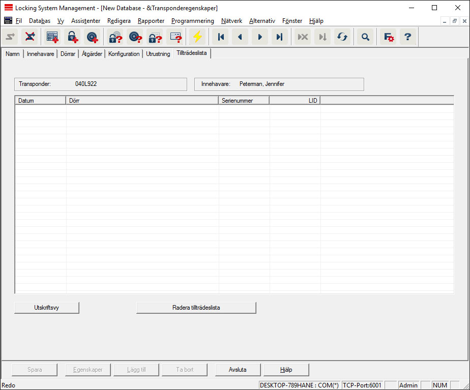 - Tillträdeslistan visas automatiskt och sparas. Den kan när som helst öppnas via registerfliken ”Tillträdeslista” i transponderns egenskaper.