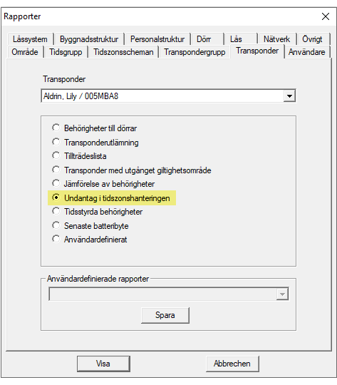 Behörigheter med ignorerade tidsgrupper kan erhållas som en rapport per identifikationsmedium: