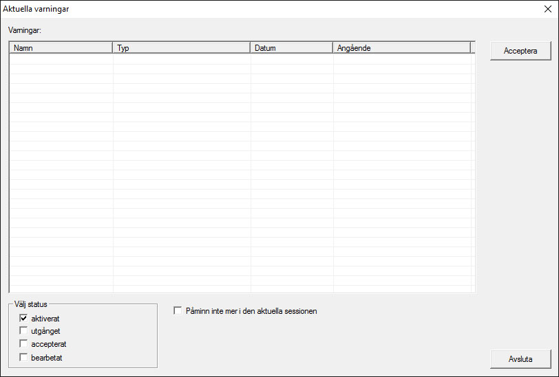 I varningsmonitorn visas varningar som uppkommit och är aktiva. Varningsmonitorn startar automatiskt vid inloggning och visar alla varningar som uppkommit. På statusraden kan du välja att även visa varningar som kvitterats eller gått ut. Dubbelklicka på posten för att visa objektets egenskaper.