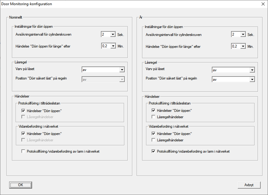 - Aktivera i området Nominellt-Händelser i områdena Protokollföring i tillträdeslistan och Vidarebefordring i nätverket de DoorMonitoring-händelser som du vill övervaka (t.ex.