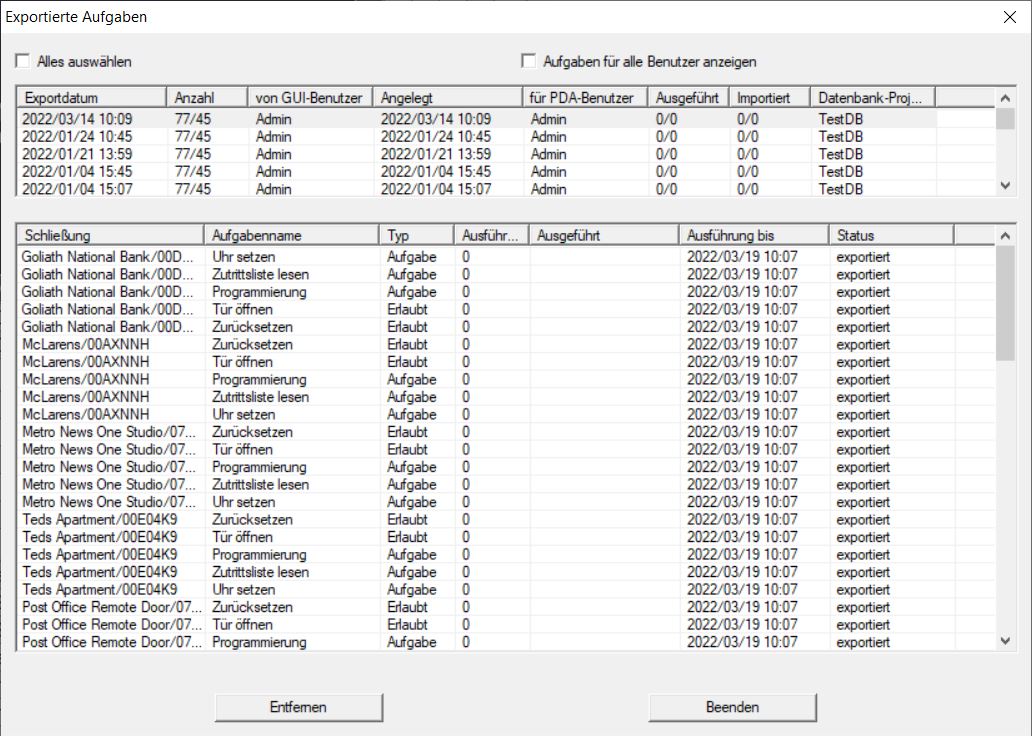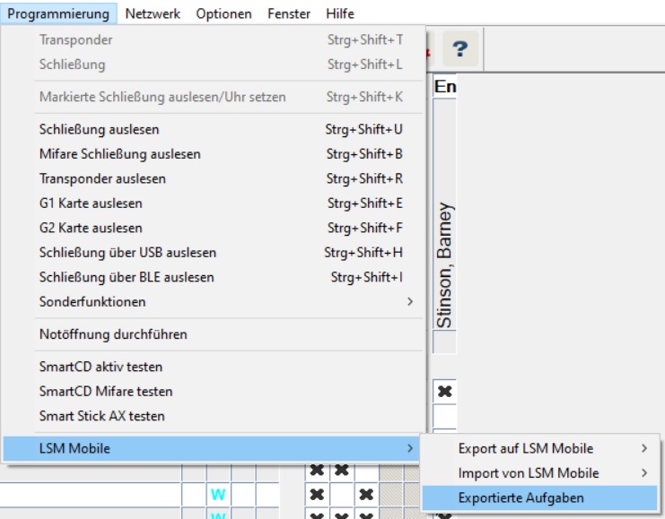 Exportierte Aufgaben - LSM MobileWählen Sie in der oberen Programmleiste über Programmierung den Eintrag LSM Mobile → Exportierte Aufgaben.Fenster Exportierte Aufgaben öffnet sich.Alle exportierten Aufgaben werden mit genaueren Angaben angezeigt.