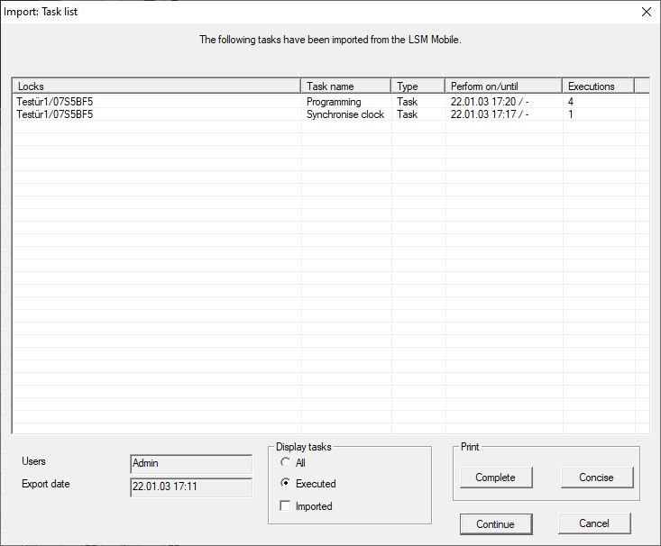 The status in the database does not match the actual status in the locking devices until the data has been reimported. You thus need to import the data back into LSM once you have completed all tasks in LSM Mobile.