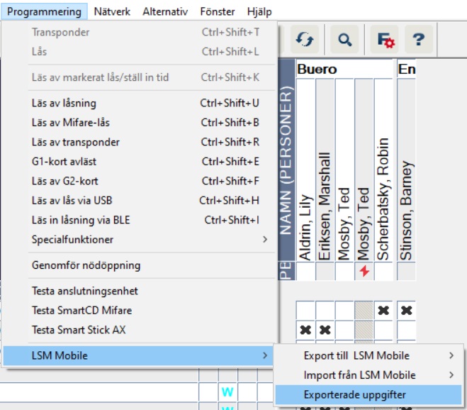 Exporterade uppgifter - LSM MobileIn den övre programraden väljer du fliken Programmering och sedan LSM Mobile → Exporterade uppgifter.Fönstret Exporterade uppgifter öppnas.Alla exporterade uppgifter visas med fler detaljer.