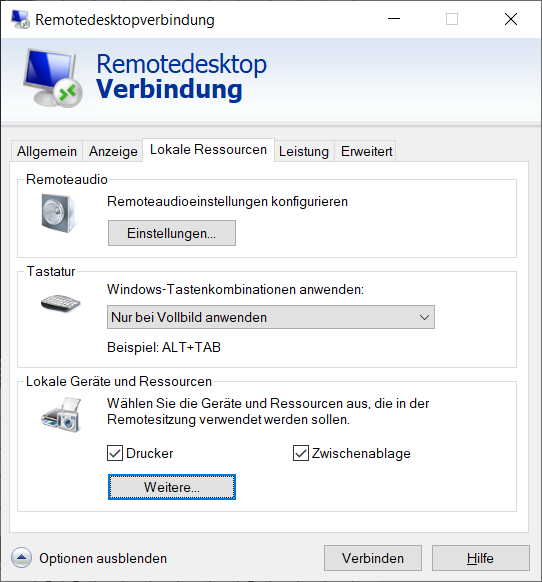 - Klicka på knappen Remotedesktop Einstellungen lokale: Weitere [offen].