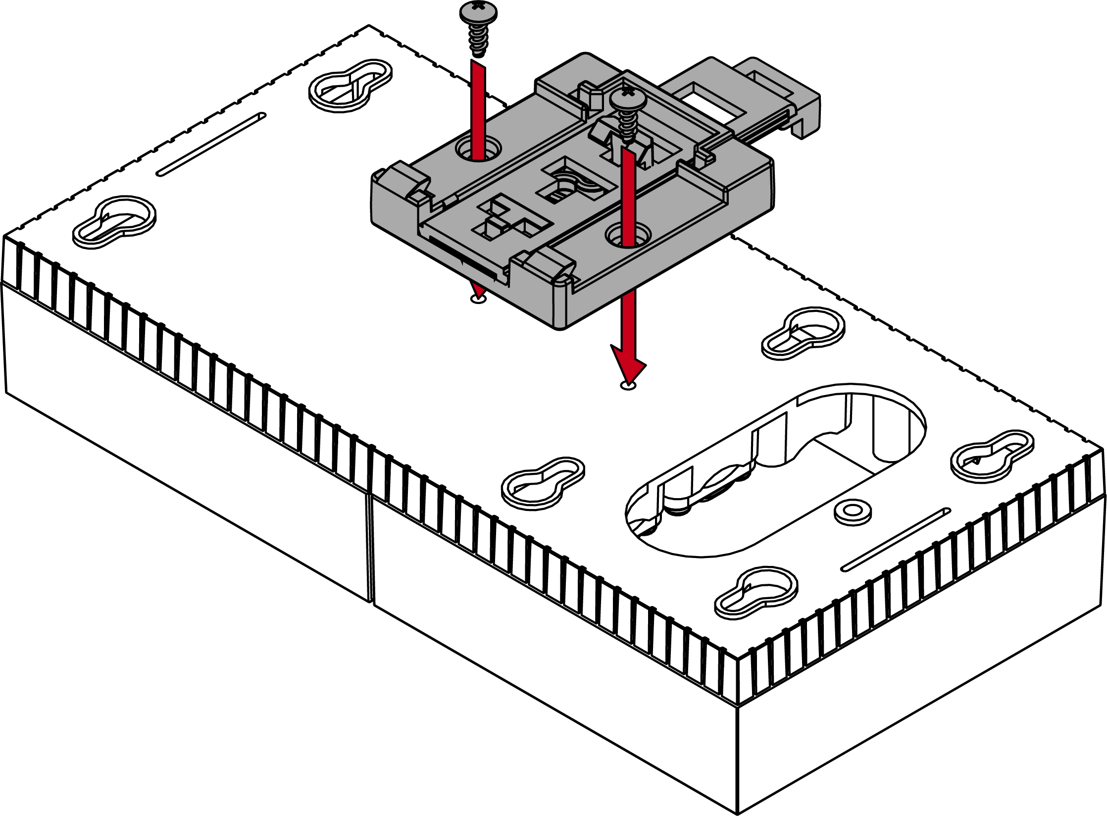 Enheden kan monteres vandret, lodret og i loftet. Du kan nemt og sikkert montere den vandret ved hjælp af de integrerede fastgørelseshuller. Montering på en DIN-skinne er også mulig med en adapter (varenummer E-22035000).