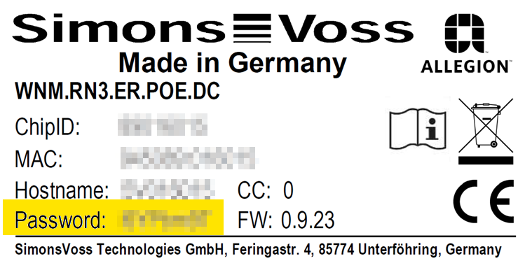 - Ange dina inloggningsuppgifter (användarnamn SimonsVoss, lösenord från fabrik enligt dekal på kretskort och hölje).