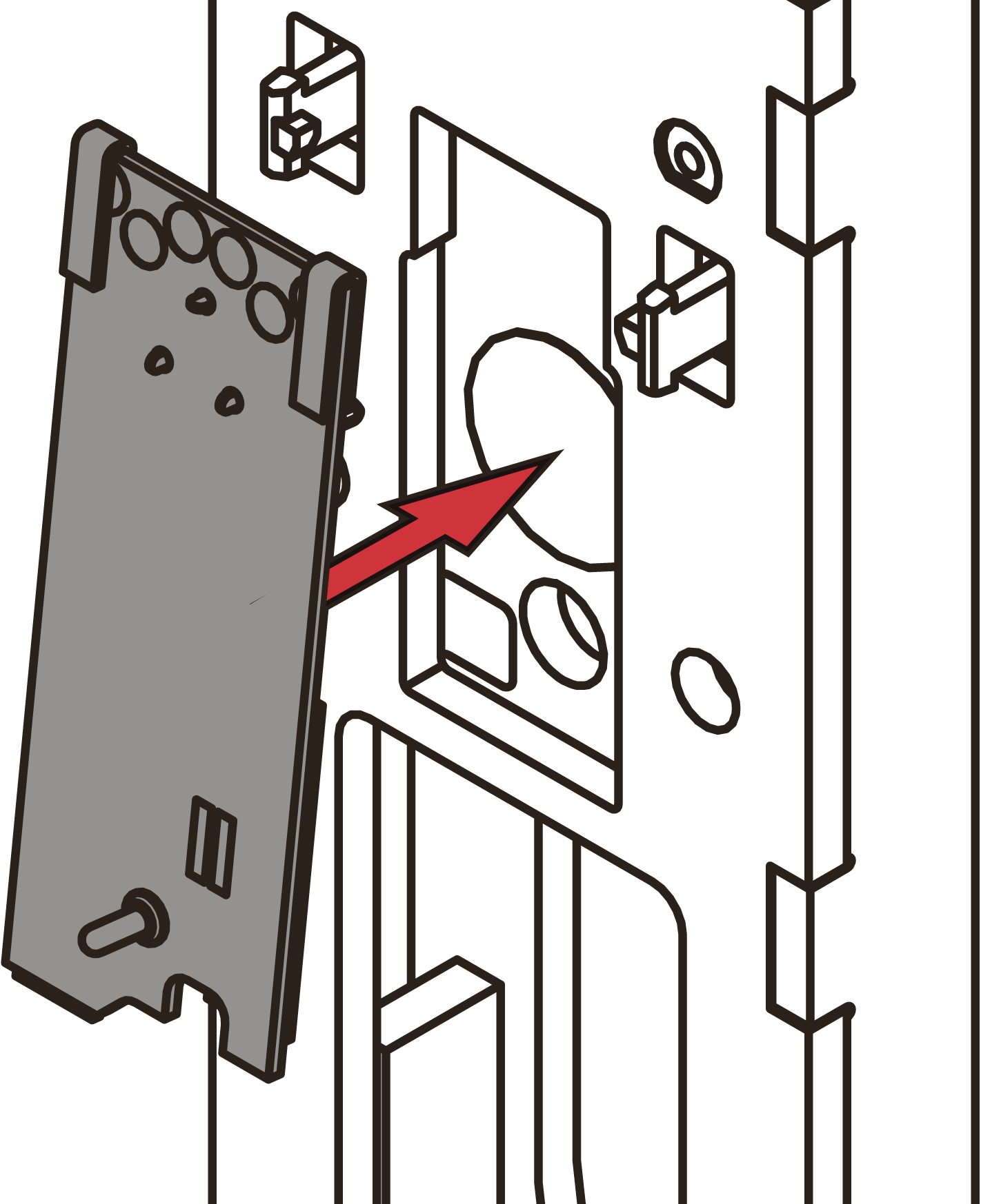 De goudkleurige metalen klem op de LockNode verbindt deze mechanisch en elektrisch (pluspool) met de SmartHandle. Wanneer u de afdekking en inlay weer hebt gemonteerd, maakt de verende metalen stift contact met de inlay (de inlay fungeert dan als antenne).