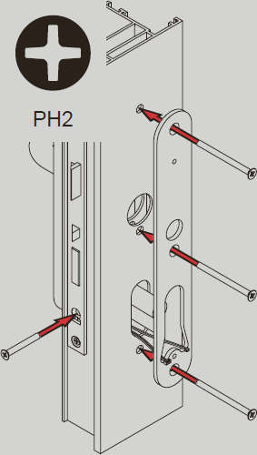 - Schroef het ingestoken buitenbeslag vanaf de binnenkant van de deur vast op de adapterplaat van het binnenbeslag.