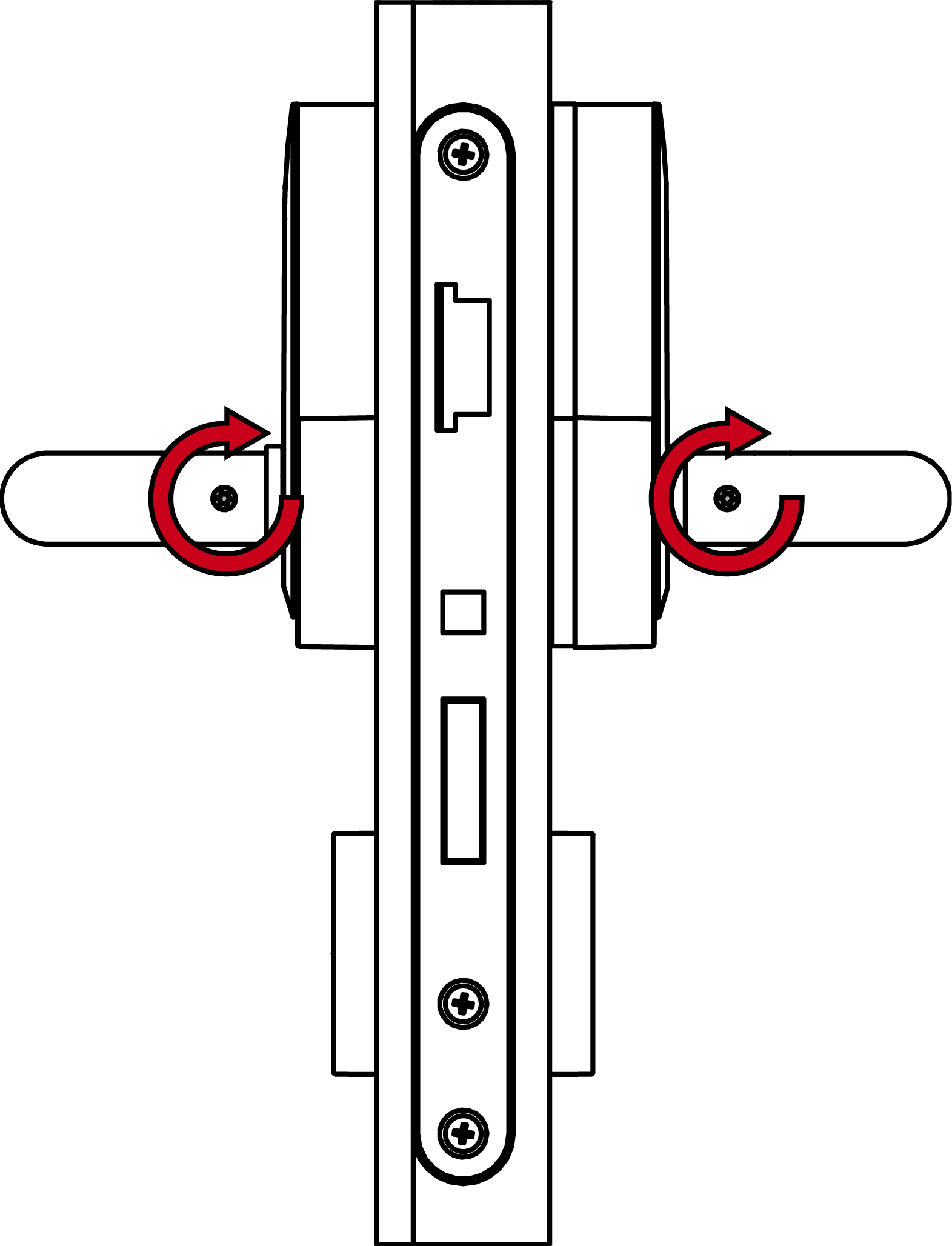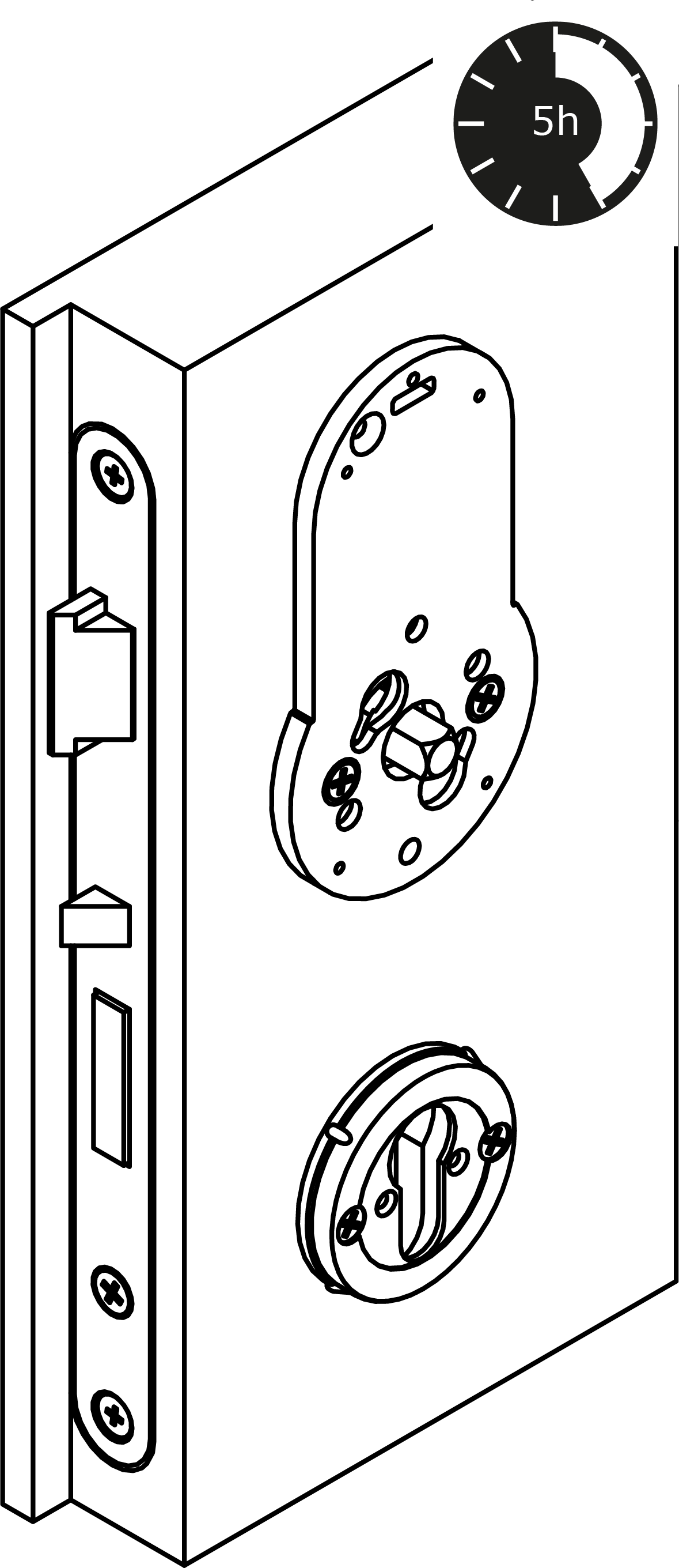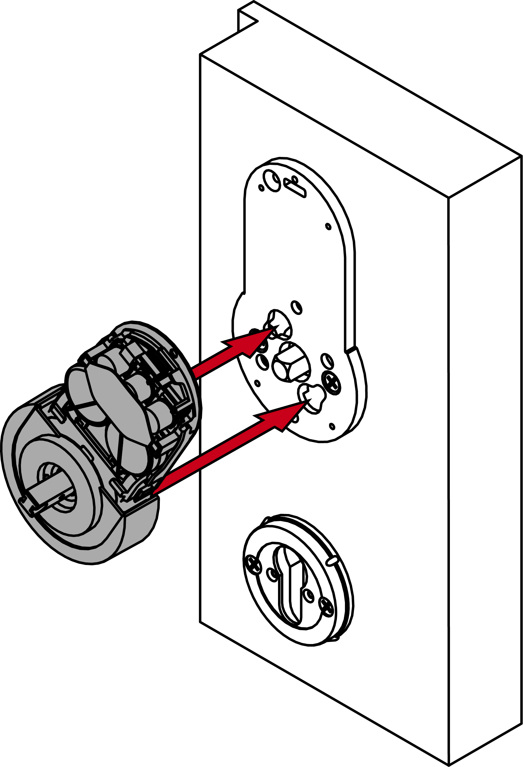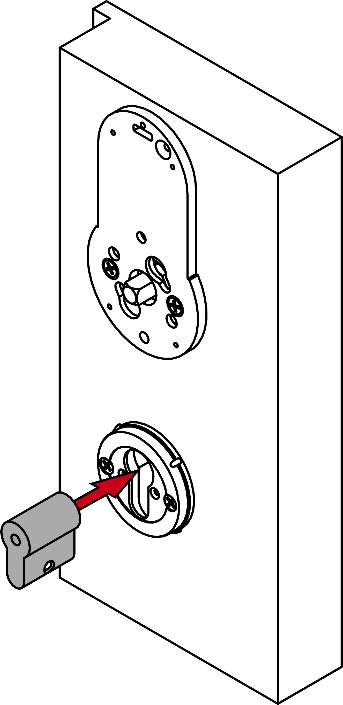 - Insérez la ferrure extérieure, le cas échéant avec des douilles d’adaptation, dans la porte depuis l’extérieur.