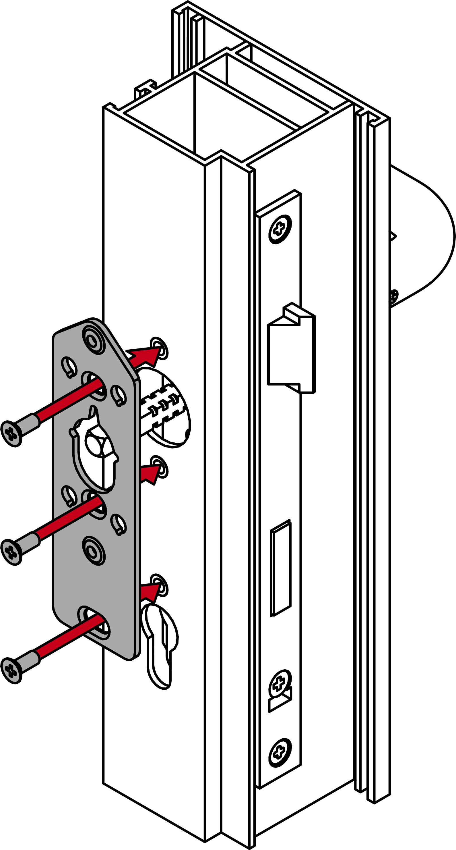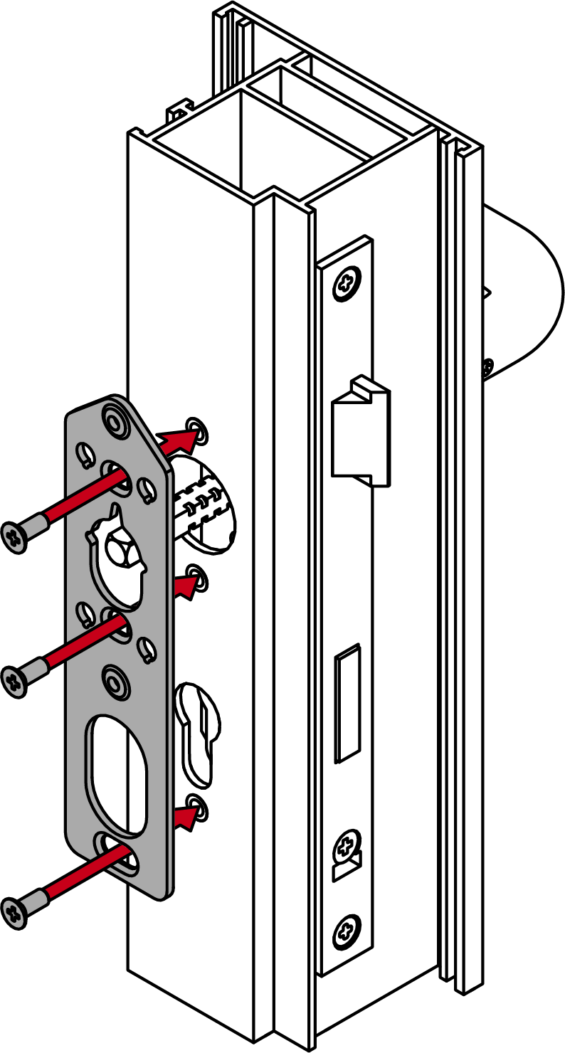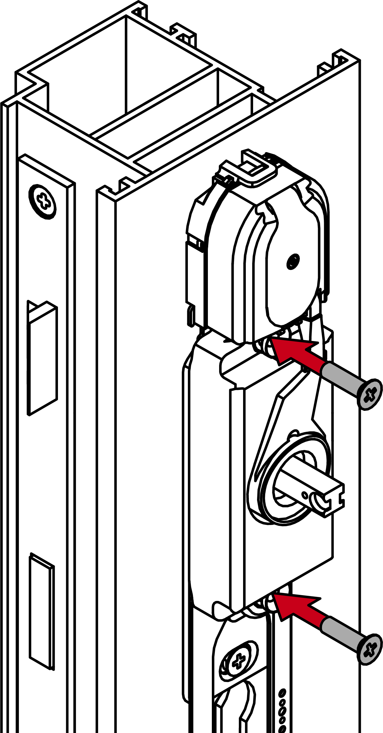 - Schrauben Sie mit den 12-mm-Schrauben die Außen-Fixierplatte mit der Spitze nach oben auf die Tür-Außenseite (PH2, Drehmoment 3,0 Nm).