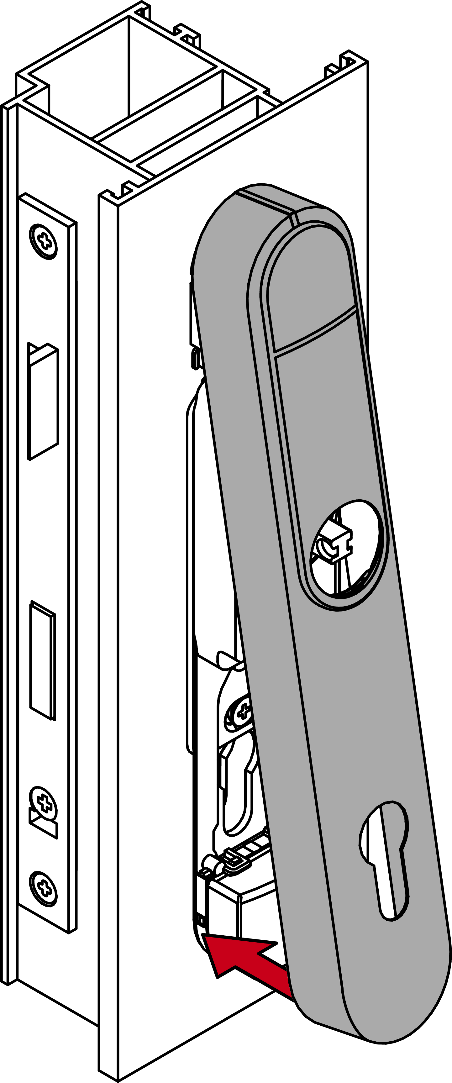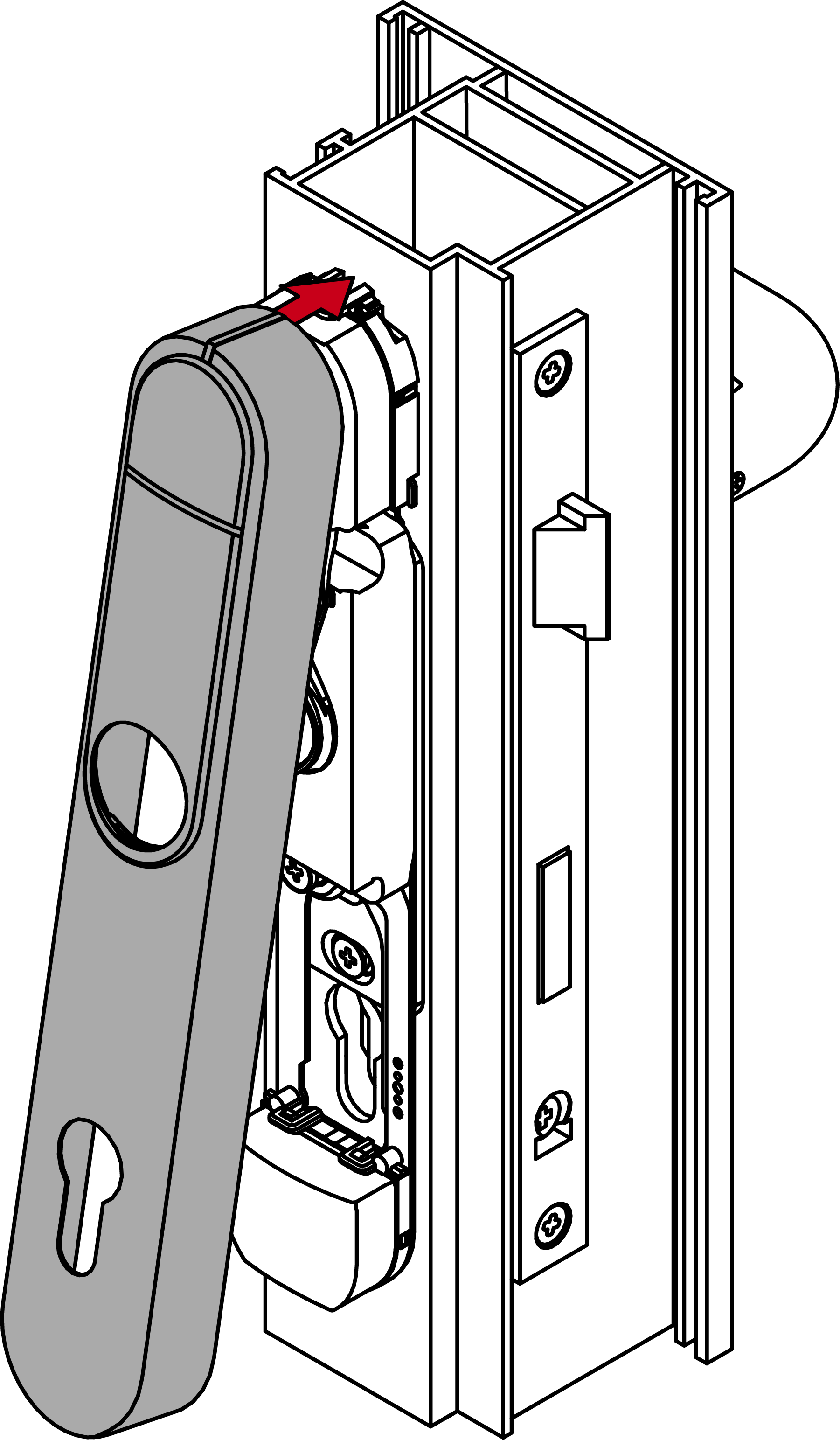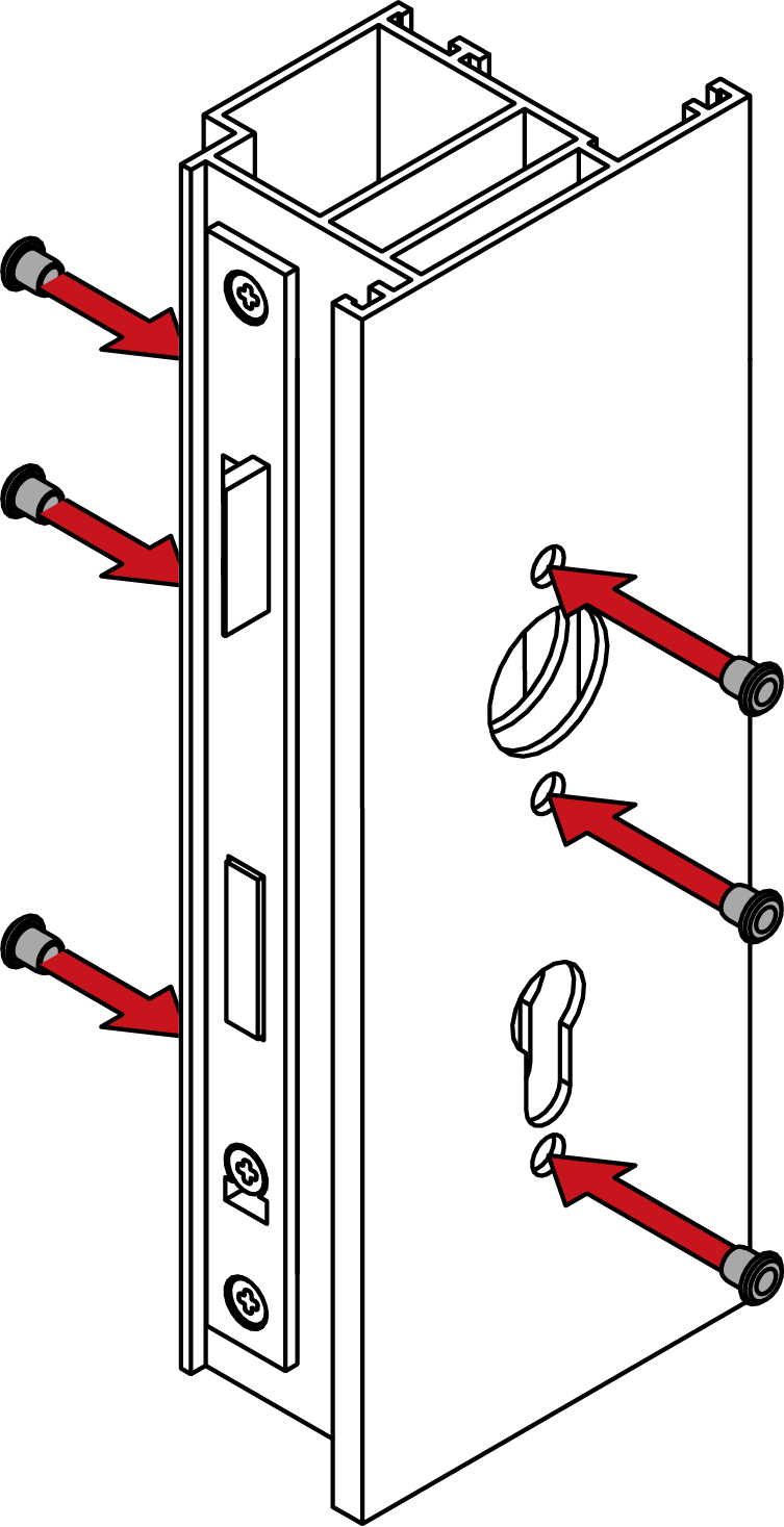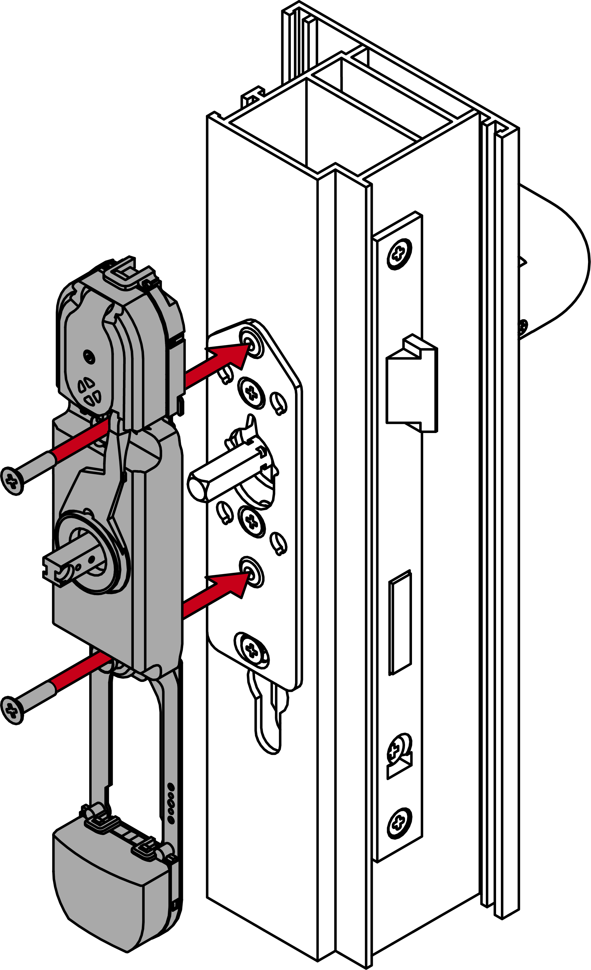- Schrauben Sie mit den 12-mm-Schrauben die Außen-Fixierplatte mit der Spitze nach oben auf die Tür-Außenseite (PH2, Drehmoment 3,0 Nm).