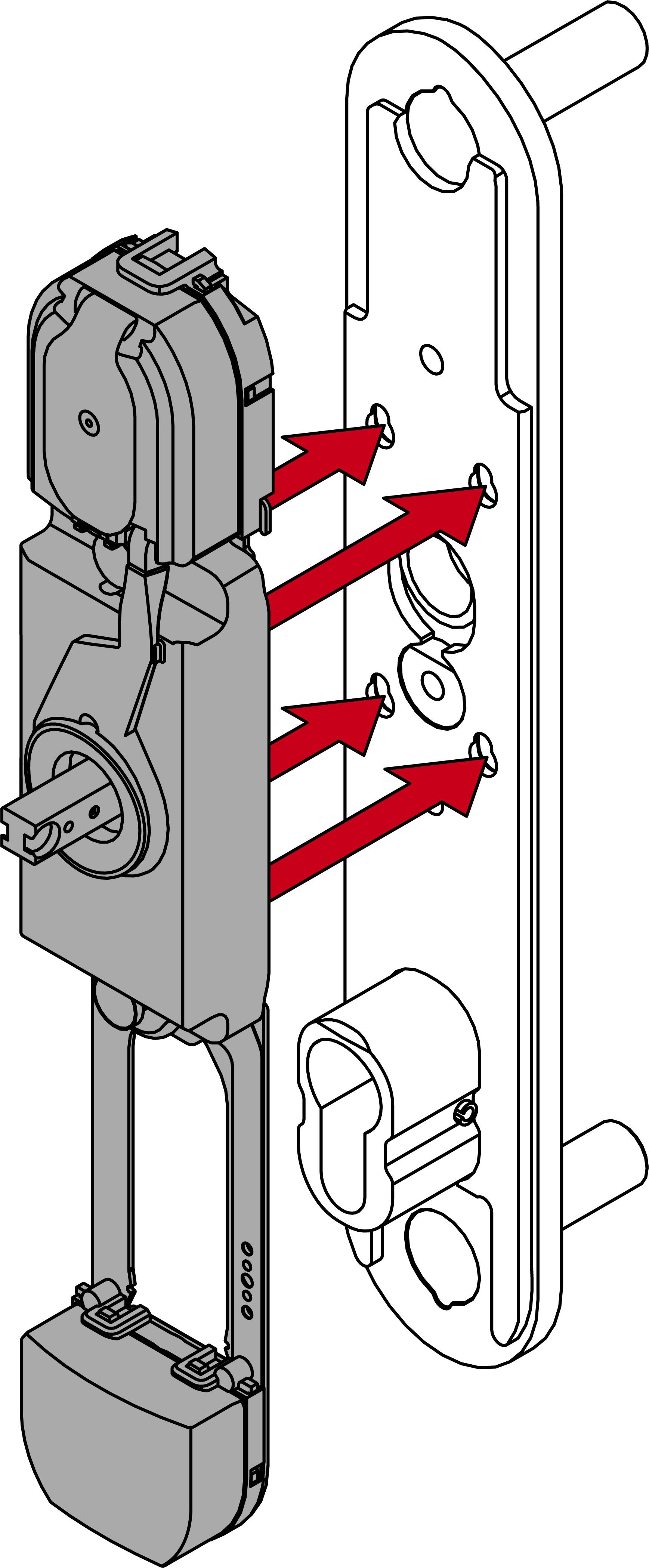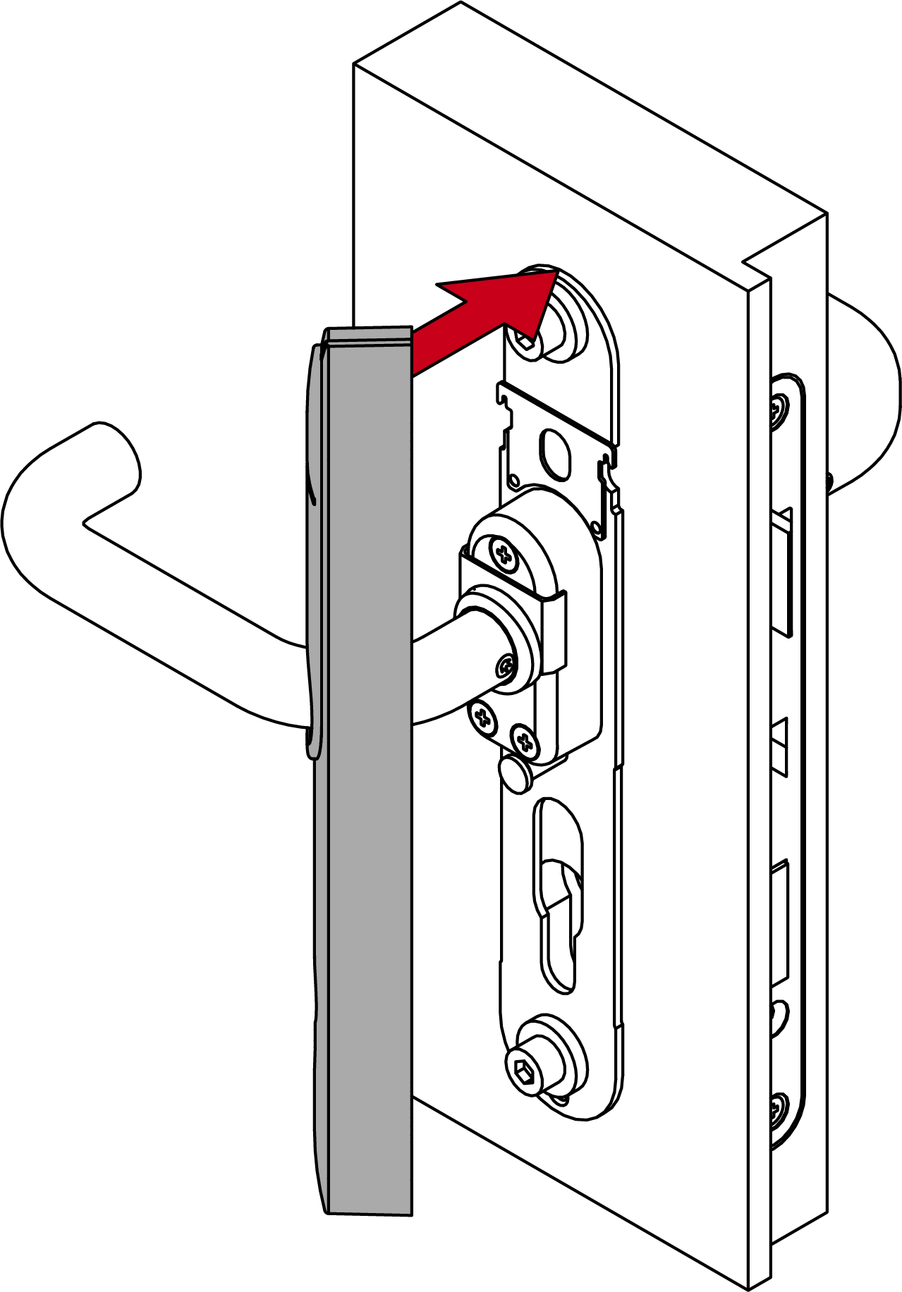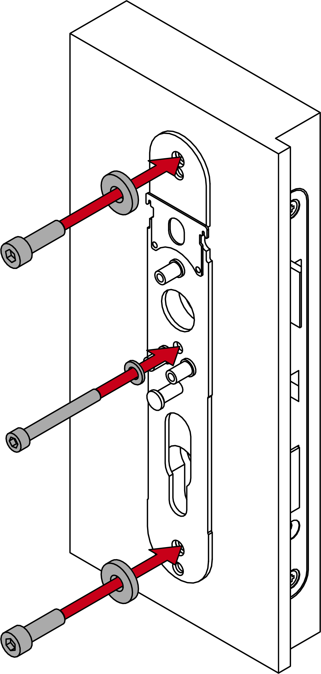 - Stecken Sie den Modulträger mit der Fixierplatte und der Bohrschutzplatte in die Tür-Außenseite.