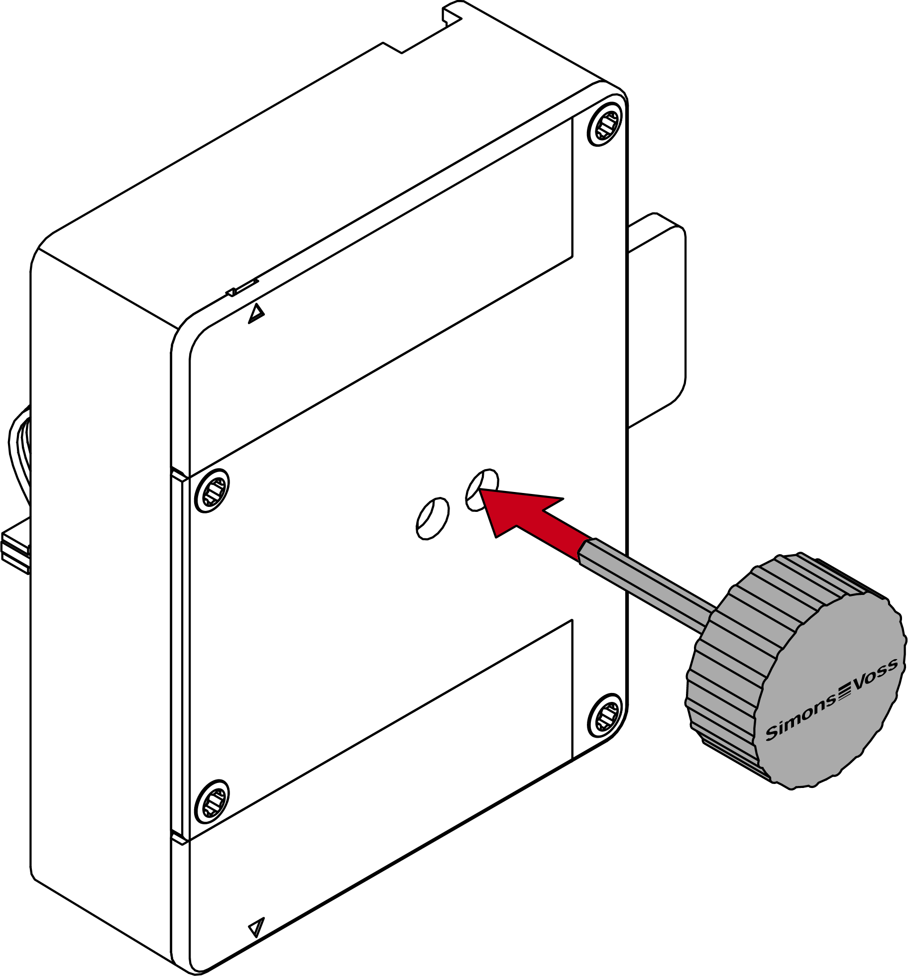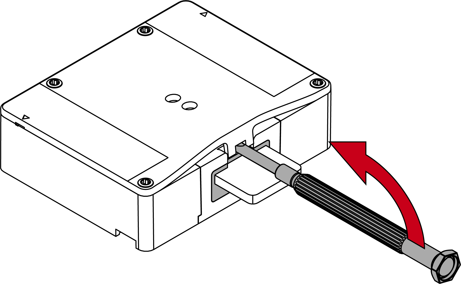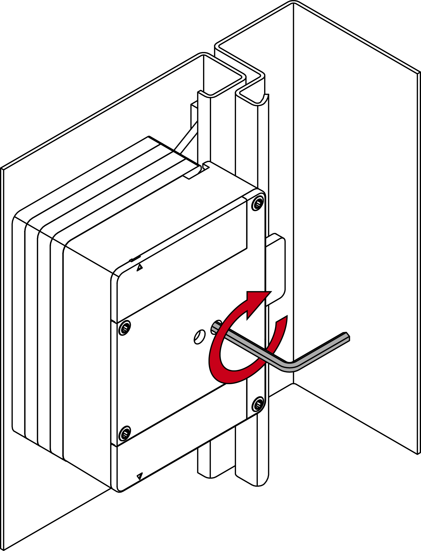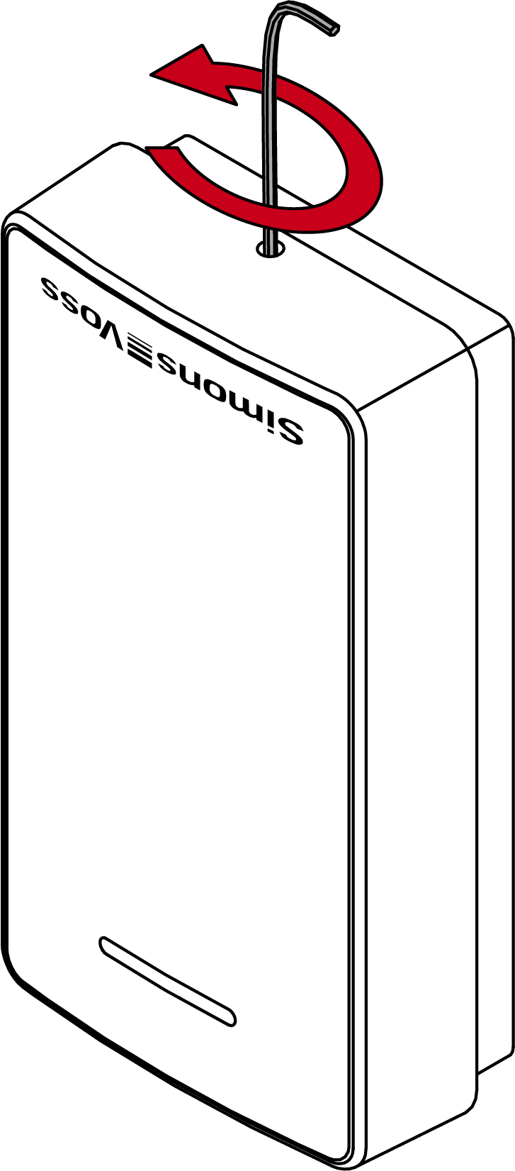 - Druk het deksel zacht tegen de bodem en draai de onderste schroef linksom los (0,9 mm inbussleutel) totdat hij gelijk is met het dekseloppervlak.