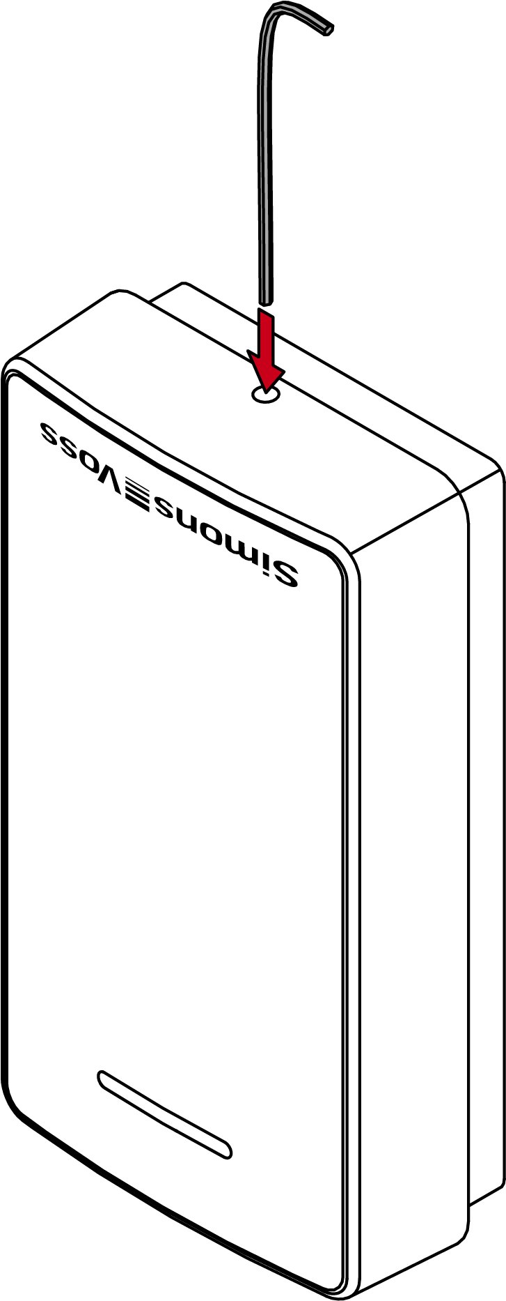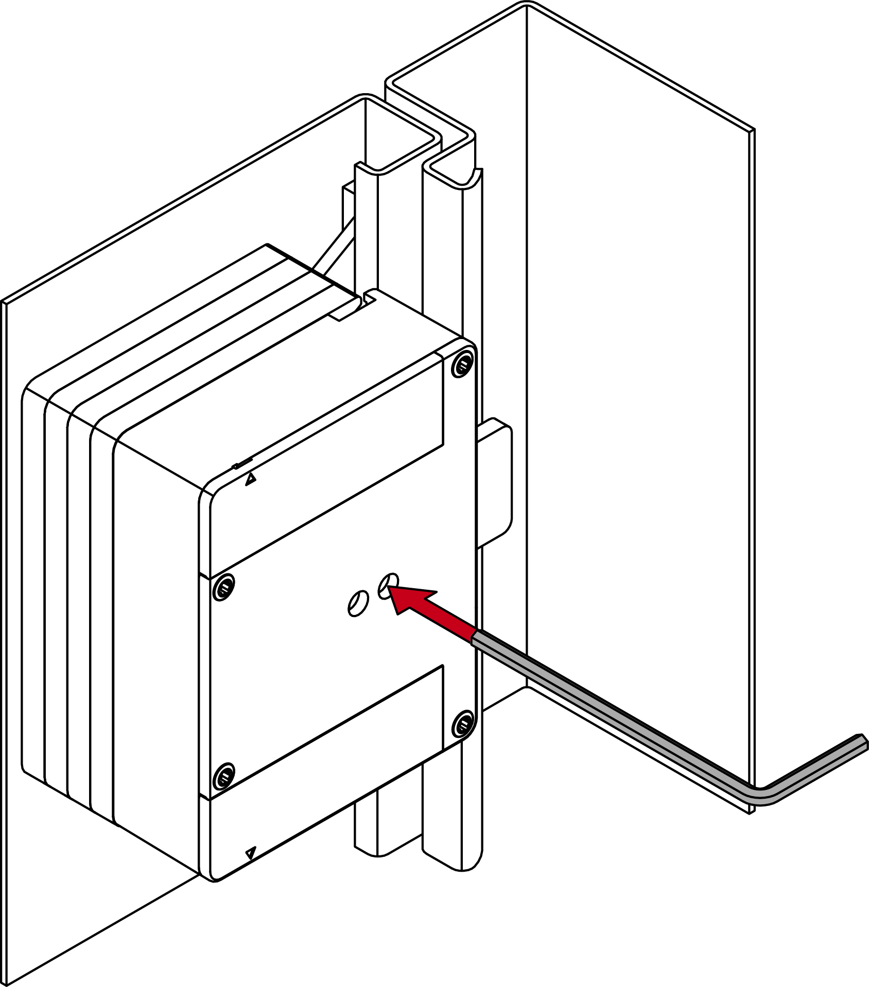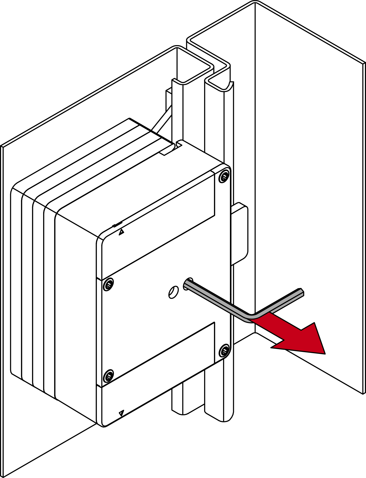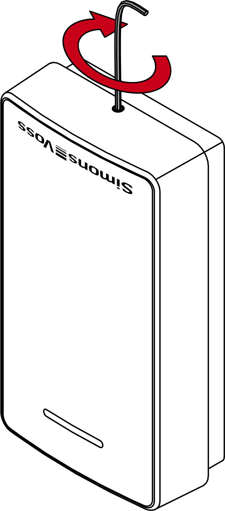 - Druk het deksel zacht tegen de bodem en draai de onderste schroef linksom los (0,9 mm inbussleutel) totdat hij gelijk is met het dekseloppervlak.