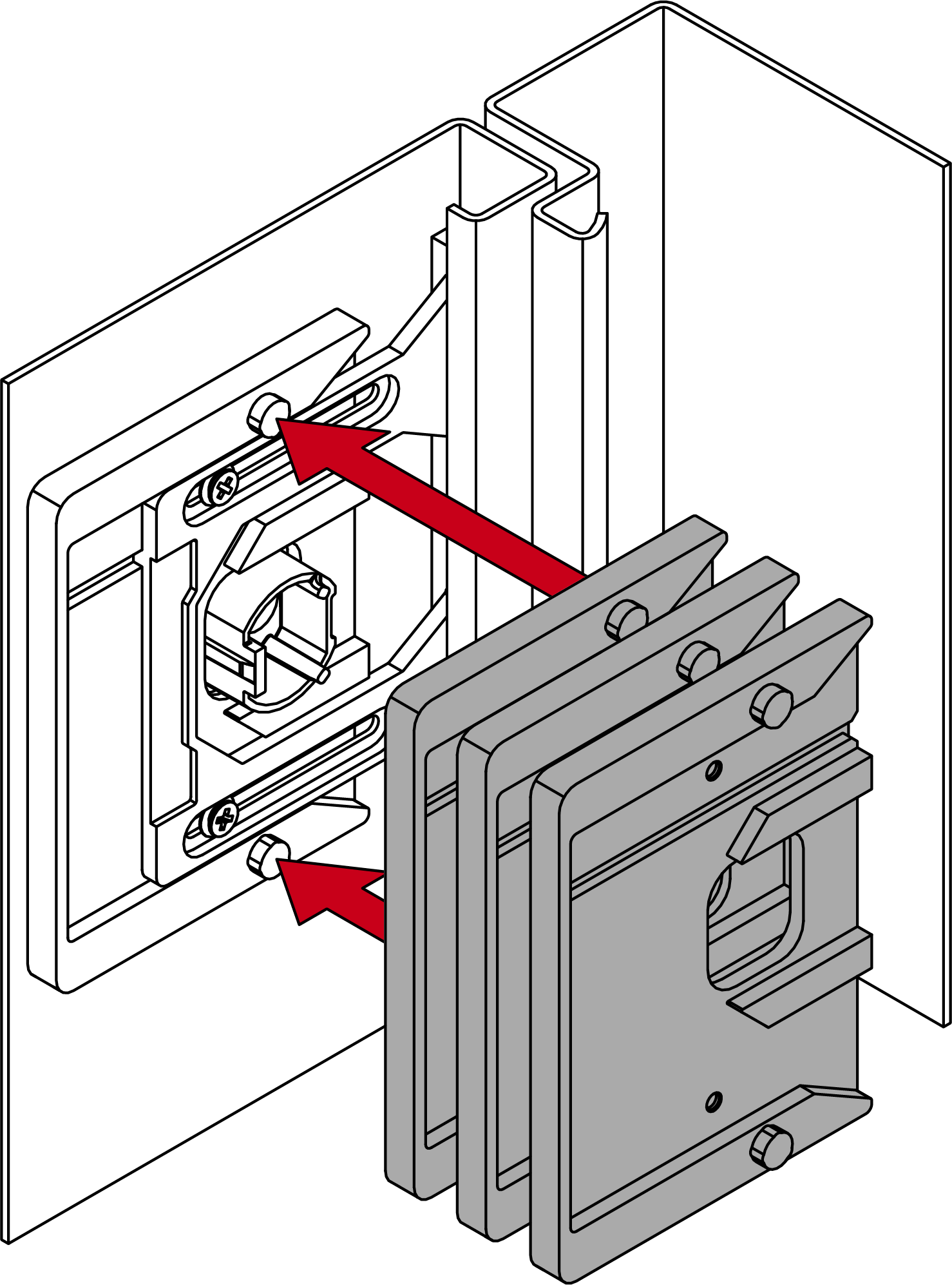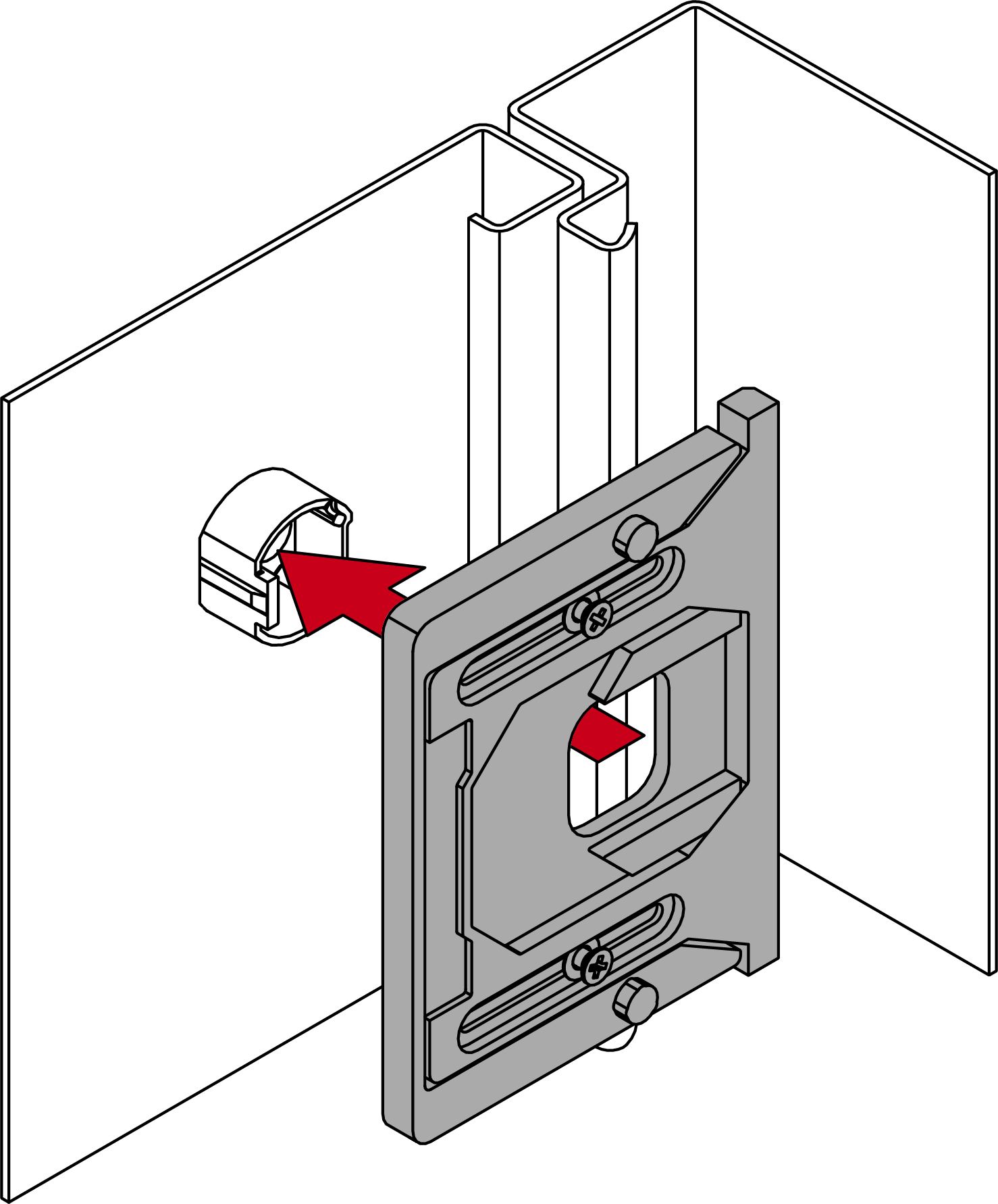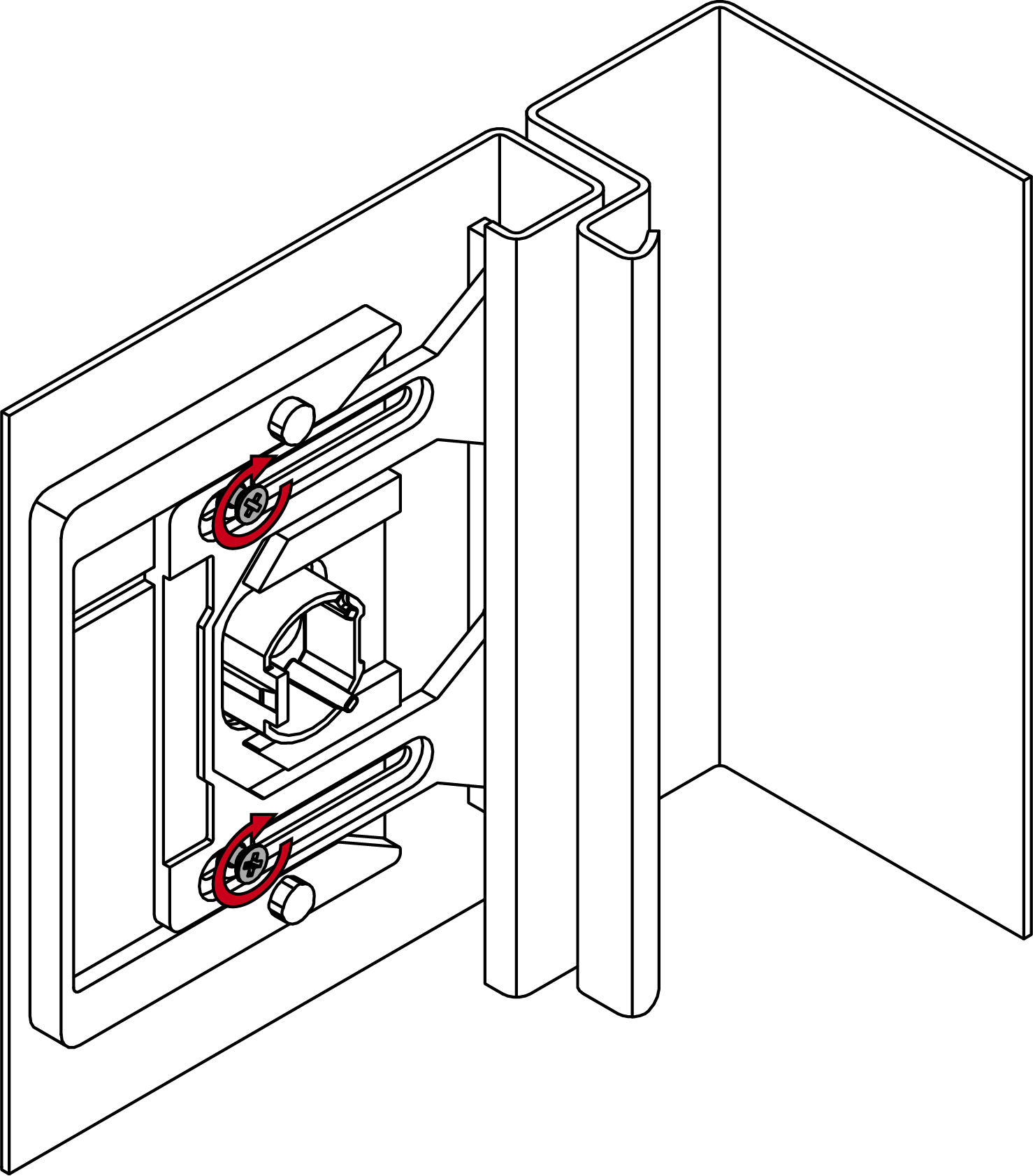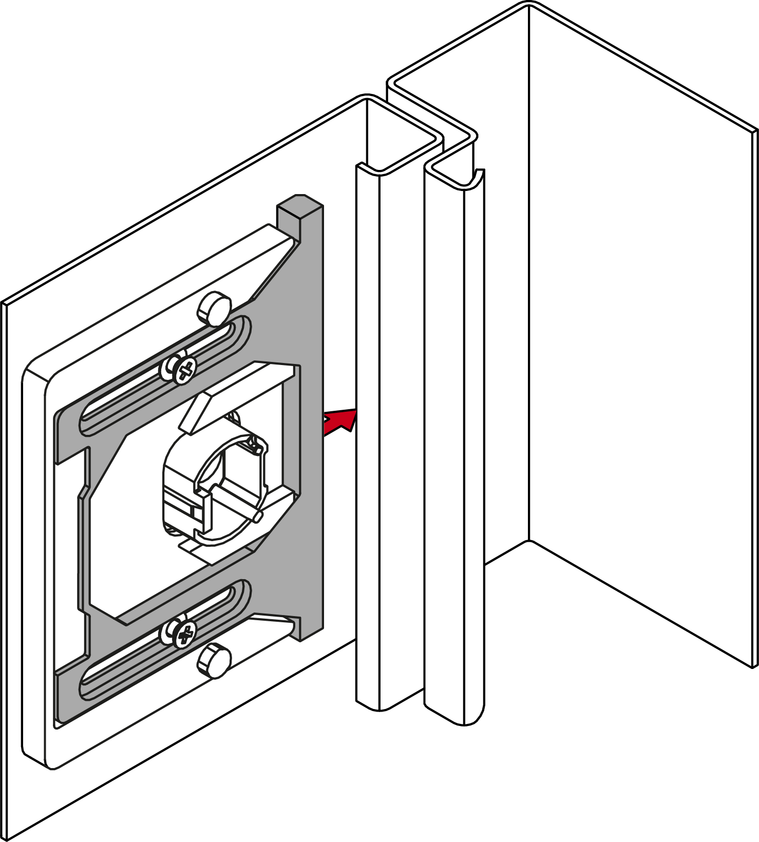 - Druk de geforceerde geleiding verder tegen de binnenkant en draai de schroeven met ca. 20 Ncm aan (PH1-schroevendraaier) totdat de geforceerde geleiding niet meer kan worden verschoven.