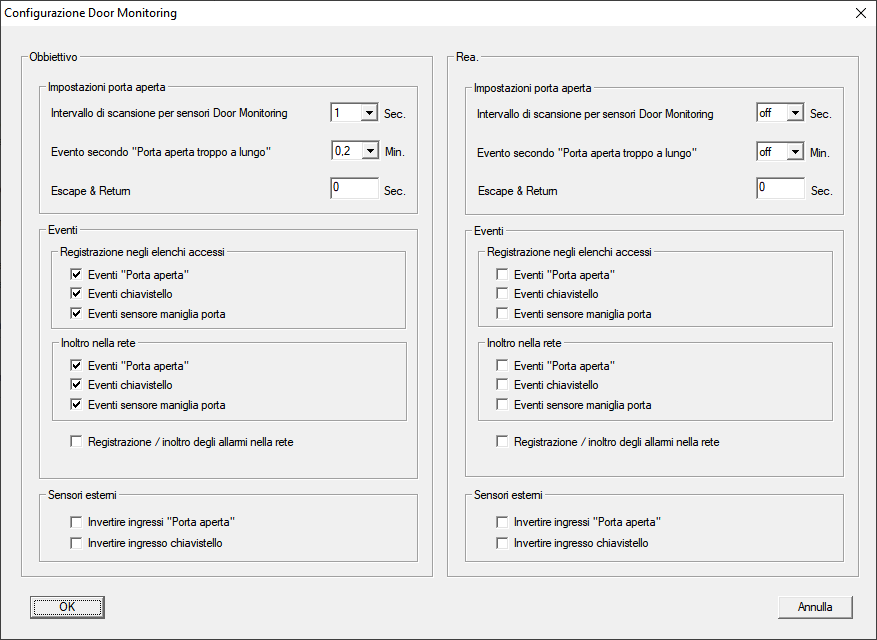 - Attivare nell’area Obbiettivo-Eventi nelle aree Registrazione negli elenchi accessi e Inoltro nella rete gli eventi DoorMonitoring, che si desidera monitorare (ad es.