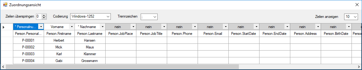 - Wählen Sie die passenden Datentypen aus (siehe nachstehende Tabellen ab Kapitel Neue Personen mit Transpondern anlegen), mindestens aber verbindliche Pflichtzuordnungselemente (mit einem Sternchen markiert).