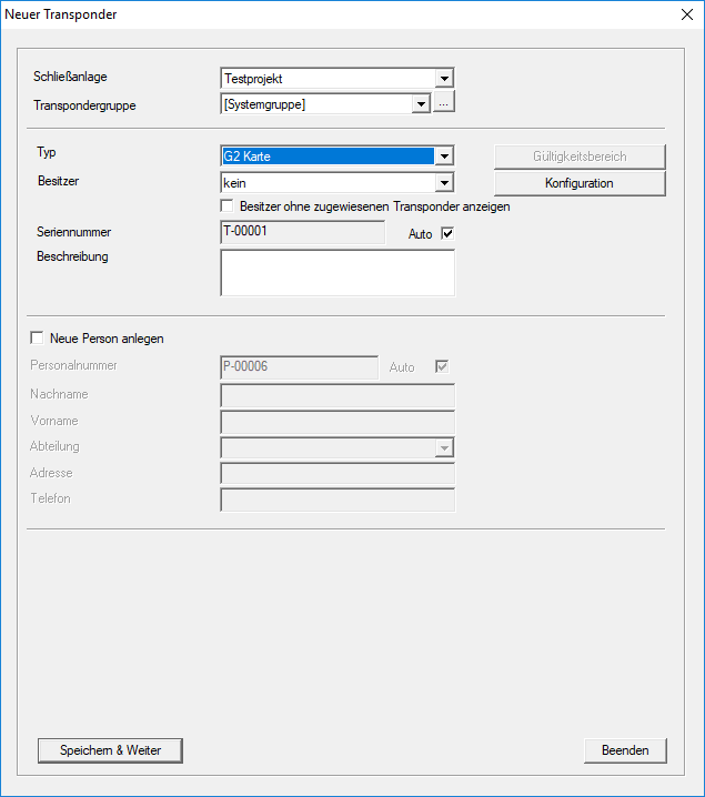 - Fenster Neuer Transponder öffnet sich.