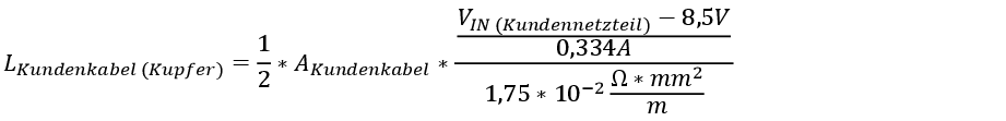 Sie können mithilfe des Formulars eine Überschlagsrechnung für Kupferkabel durchführen. Das Formular berücksichtigt die maximale Leitungslänge, die sich aus dem Spannungsabfall ergibt. Sie prüft keine anderweitigen Störeinflüsse wie Übergangswiderstände oder elektromagnetische Störfelder, die die maximale Kabellänge auf 300 m begrenzen. Folgende Formel wird verwendet: