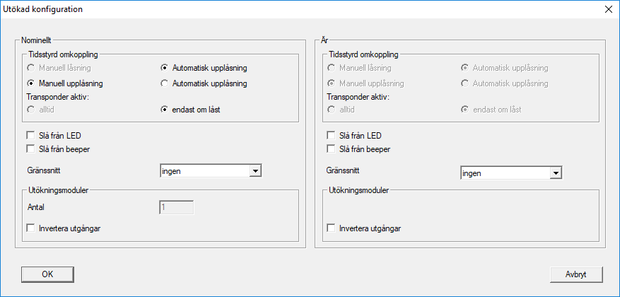 - Ställ in alternativen för automatisk och manuell låsning och upplåsning i området Tidsstyrd omkopplingenligt dina önskemål (se Utökad konfiguration utan SmartOutput-modul och Utökad konfiguration med SmartOutput-moduler).