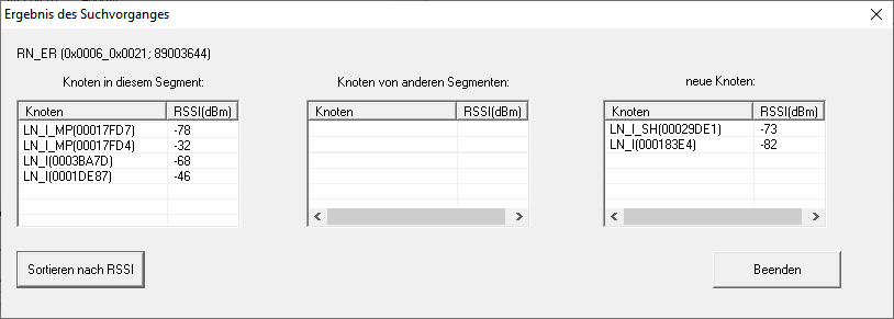 Name des LockNodes | Signalstärke der Verbindung des LockNodes zum suchenden RouterNode |
