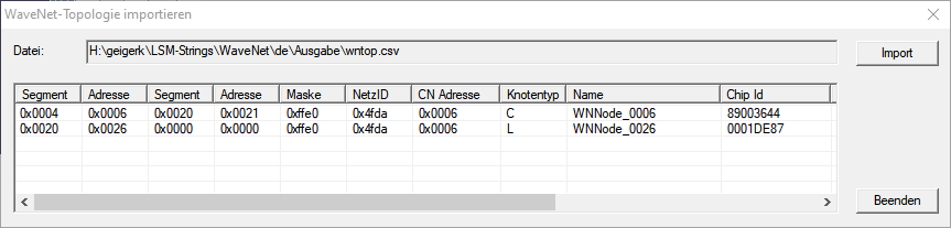 - Fenster WaveNet-Topologie importieren öffnet sich. Sie sehen eine Liste der zu importierenden Geräte.
