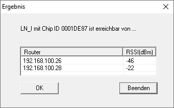 - Fenster Ergebnis öffnet sich. Sie sehen die Liste der zuvor ausgewählten RouterNodes mit Messwerten.