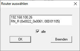 - Fenster Router auswählen öffnet sich (Wenn sich direkt das Ergebnisfenster öffnet, dann gibt es keine anderen Router-/CentralNodes im Segment. Sie müssen den LockNode zurücksetzen und an einem anderen RouterNode neu hinzufügen).