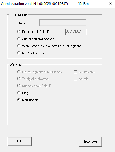 Ihre LockNodes werden zurückgesetzt und starten neu, wenn Sie die Stromversorgung trennen (bzw. den LNI ausbauen), eine halbe Minute warten und wieder anschließen (bzw. den LNI wieder einbauen). Nach dem Neustart piepen die LockNodes vier Mal.