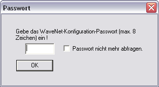 Dass Passwort muss 1-8 Zeichen lang sein. Sie können Ihr Passwort ansonsten frei wählen. Dieses Passwort wird in alle WaveNet-Komponenten programmiert. Ein nachträgliches Ändern des Passwortes ist nicht möglich!