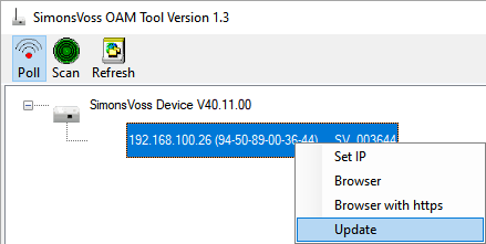U kunt de firmware zelf updaten met de Operations-, Administration- en Maintenance-Tool (OAM-tool) (alleen RN2). De OAM-tool is kosteloos beschikbaar onder het menupunt Downloads op de website van SimonsVoss (https://www.simons-voss.com). U hoeft de OAM-tool niet te installeren.