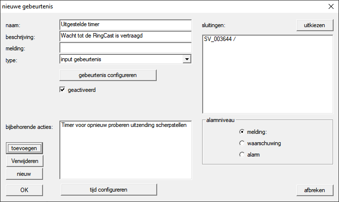 - Stel een vertraging in die een minuut langer duurt dan de maximale tijdsduur van de overdracht van de RingCast (zie Maximale duur van de overdracht in de RingCast).