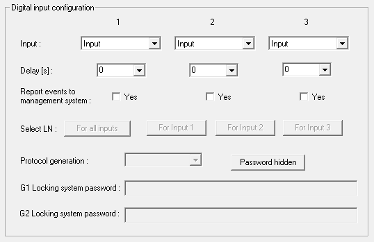 Klicka på knappen för respektive ingång (för input 1, 2 eller 3). Fönstret för ingången öppnas. Markera de LockNodes som ska reagera på den här ingångens händelser. Gå tillväga på samma sätt för de övriga ingångarna. LockNodes som är markerade här reagerar på alla händelser hos den här ingången. De utför den reaktion som du har fastställt för ingången. | Klicka på knappen For all inputs och välj LockNodes. LockNodes som är markerade här reagerar på alla händelser hos de här ingångarna. De utför den reaktion som du har fastställt för respektive ingång. |
